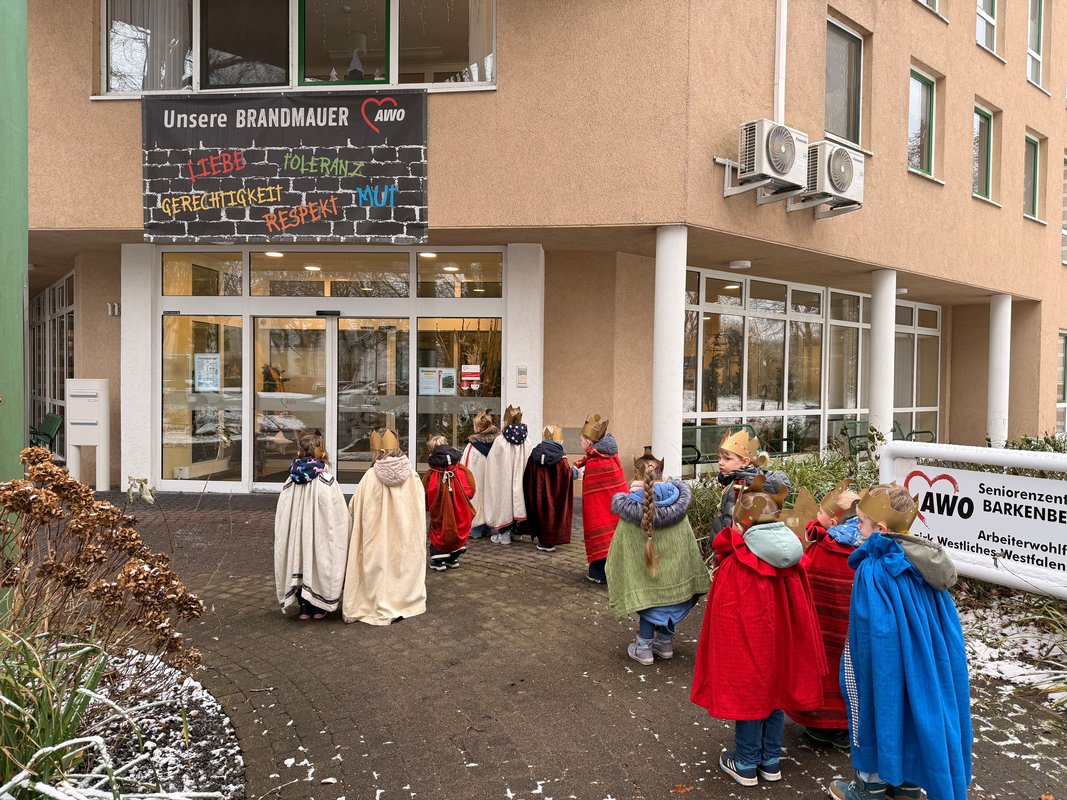 Hoher Besuch erfreute die Bewohner*innen des Seniorenzentrum Barkenberg am 06.01.2026. Gleich 13 Kinder der KiTa “St. Barbara” aus Wulfen kamen als Heilige Könige und Königinnen verkleidet in unser Haus, um den Segen an die Menschen zu verteilen. Nicht nur die charmanten Erscheinungen der 4-6-Jährigen brachten die Augen unserer Bewohner*innen zum leuchten, denn die kleinen Gäste sangen eifrig und verbreiteten eine festlich-besinnliche Stimmung in der Einrichtung. Besonders gut gefallen hat den Bewohner*innen das Versprechen der KiTa-Leiterin Fr. Szczesny, auch im nächsten Jahr mit einer Gruppe Sternsinger zu Besuch kommen zu wollen.